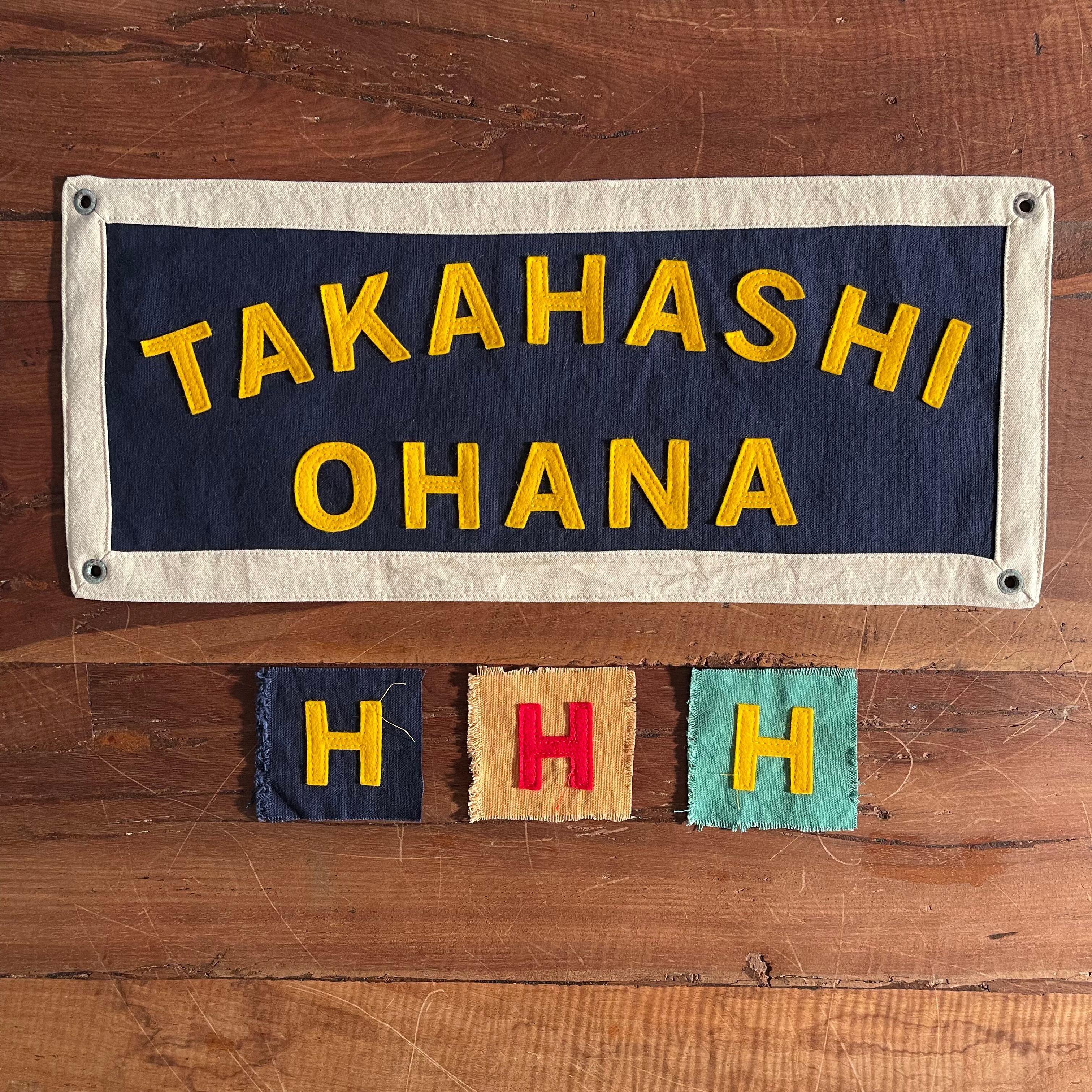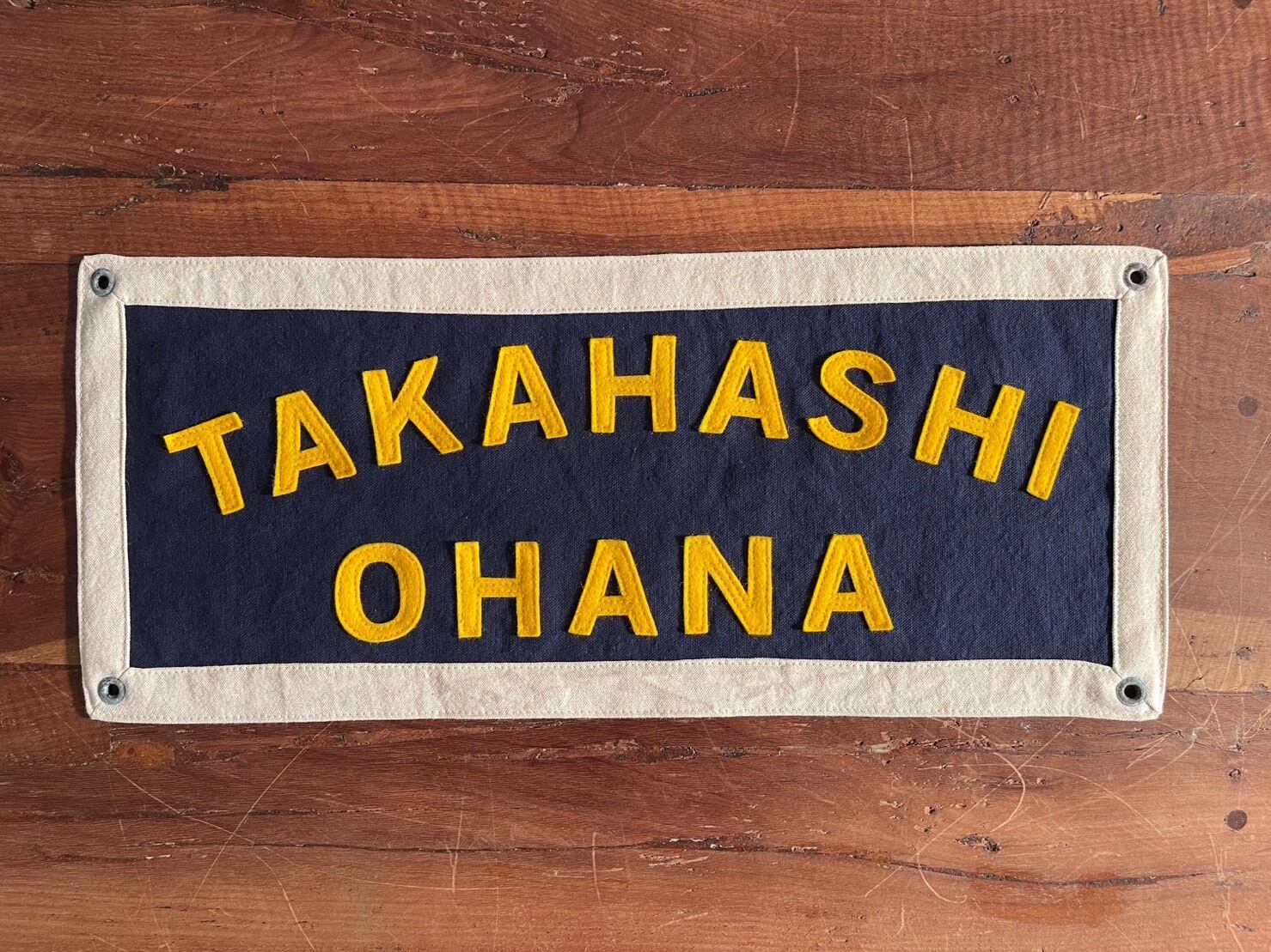 「ハワイスタイル」マガジン63号の特集「オハナ」に合わせて制作した「ハワイアンスタンダード」によるヴィンテージ仕上げのカスタム・メイド・ペナント。ハワイのカイルアで作られるハンドメイドで、アーチ状の文字(TAKAHASHIの部分)は最大9文字まで好きな言葉(英字)が入れられる。部屋に飾ればOHANAの絆(きずな)が増すこと請け合いです!