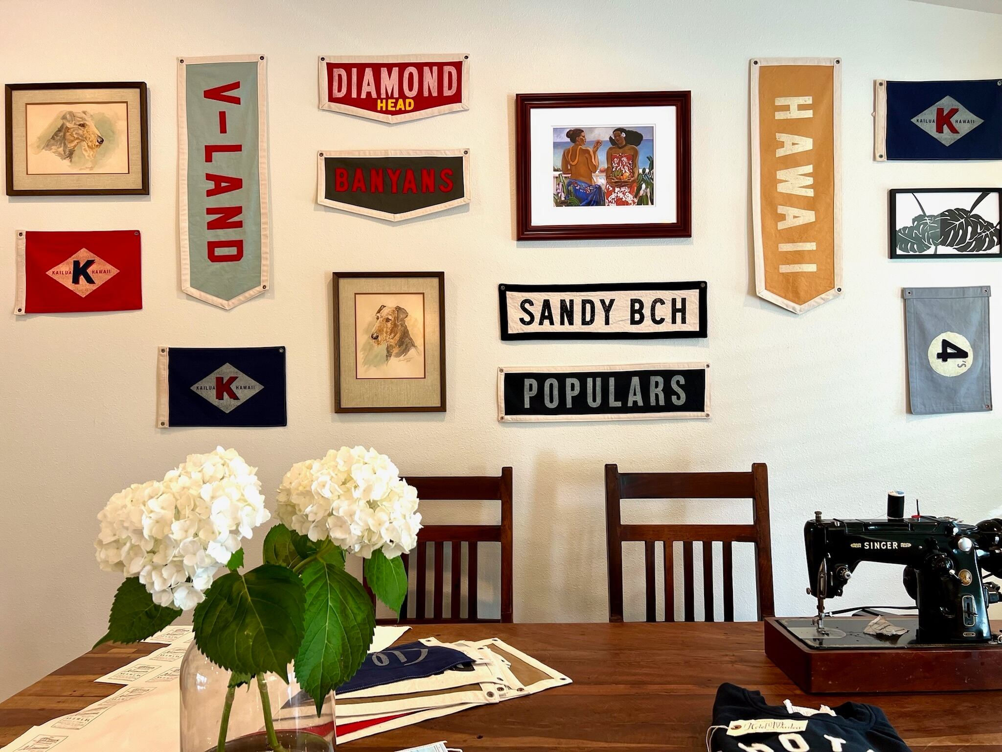 南カリフォルニアから毎年のようにサーフトリップでハワイに訪れ、ついには移住を果たしたジョー・スパークスさん。ハワイへの愛は人並み以上に強く、それゆえカイルアにある自宅兼アトリエで作るペナントにも一切の妥協はない。どこかハワイへの郷愁を誘うのも、ジョーさんのハワイへの思い入れが詰まっているからに他ならない。