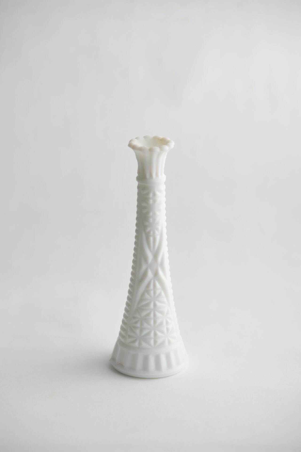 マグカップなどアメリカで昔流行ったミルクガラス素材で作られた白い花瓶。レトロな模様がおしゃれ。ガソリンスタンドなどで配られていたノベルティグッズと思われる。