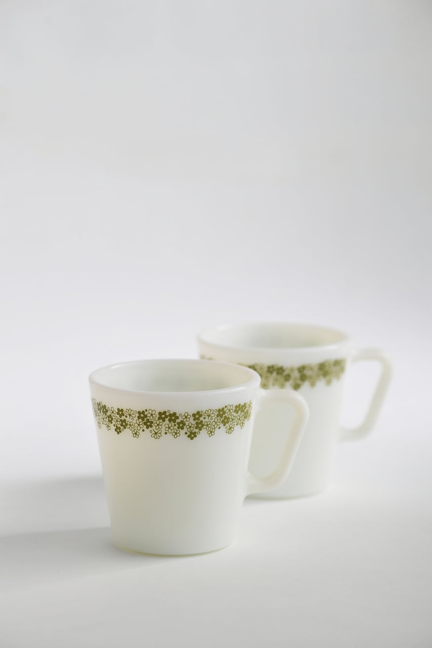 ’60年代に大量生産されていたパイレックス社のミルクガラス・マグカップ。パイレックスの代名詞ともいえる花柄はクレイジーデイジーの愛称で親しまれ、コレクターも多い。
