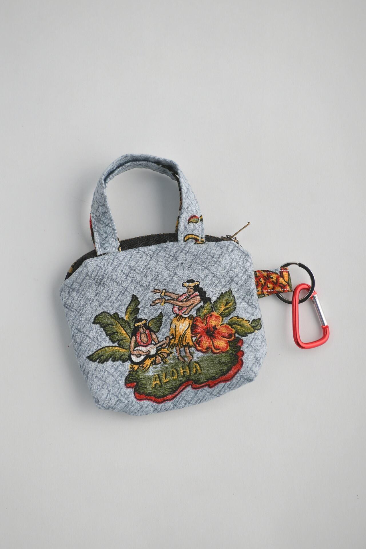 表はフラガール、裏はウクレレのイラストが入ったヴィンテージ生地のトート型ミニケース。カラビナ付きで便利。